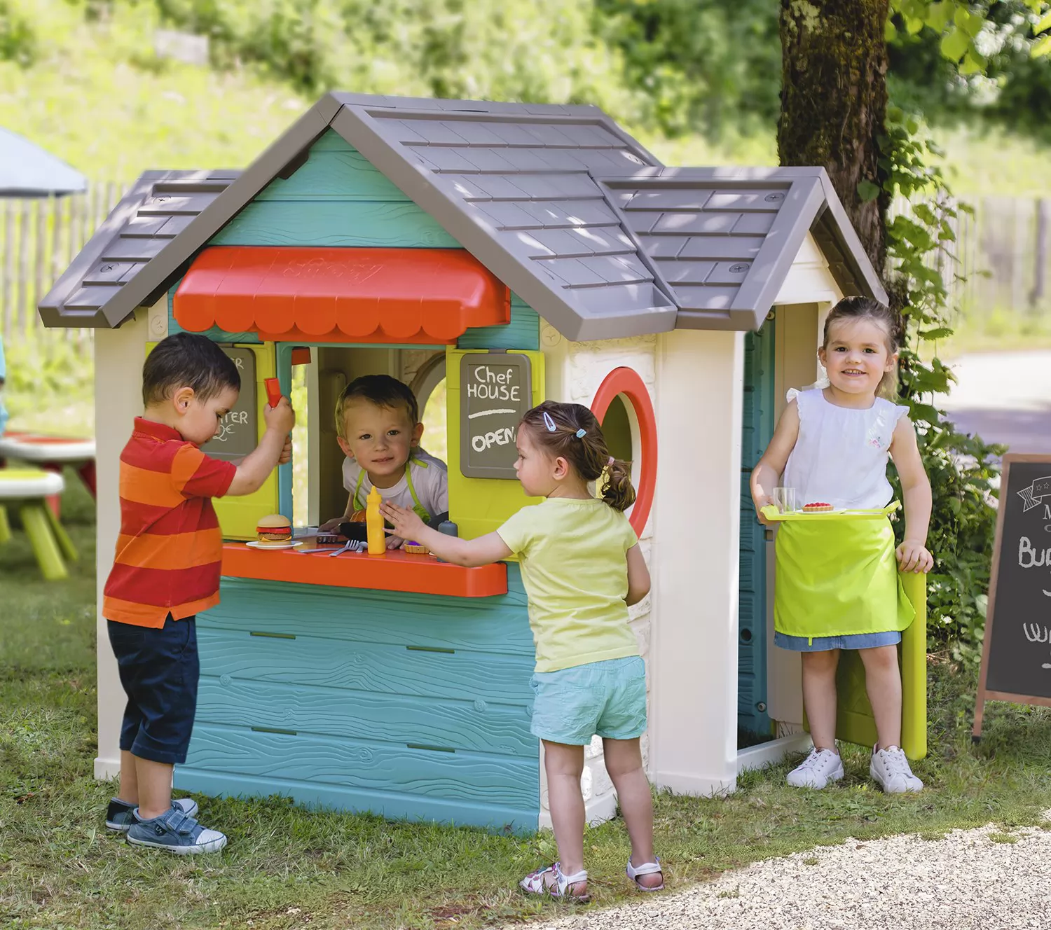 La Chef House de Smoby combina una casita de exterior con la cocina de un restaurante.La diversión será doble para los más pequeños. Con plancha de cocina, fregadero, horno, lavavajillas y hasta una caja registradora. El restaurante de Smoby cuenta con 2 ventanas que puedes cerrar, puerta, mostrador para atender a los clientes y 38 accesorios de cocina. Esta indicada para niños y niñas de más de 2 años.