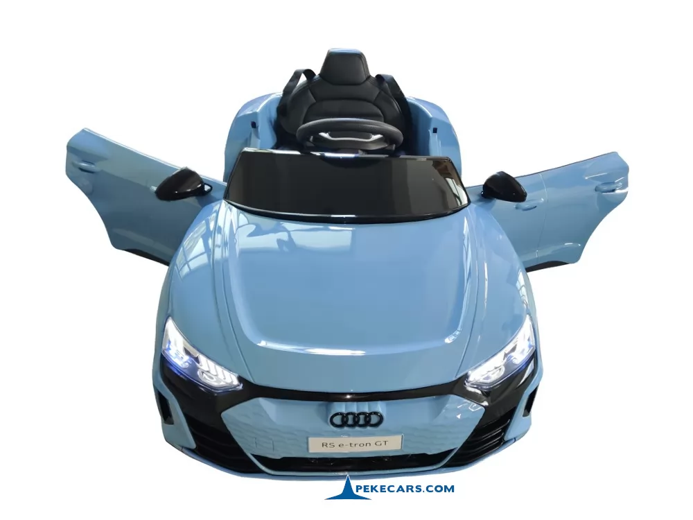 Llega a Pekecars el coche oficial de la marca audi: RS e-tron gt en color azul para niños. Esta preciosidad de coche viene con las ruedas de caucho antipinchazos que son muy silenciosas y resistentes ya que se trata de goma comprimida, mucho mejor que las antiguas ruedas de plástico.