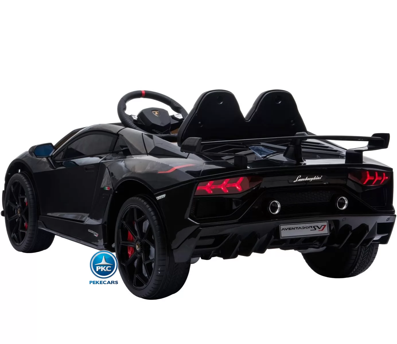 El nuevo Lamborghini Aventador SVJ para niños es la novedad de este año con tecnologia de vanguardia. Con auténtico color negro pintado, este coche viene equipado con asiento acolchado en piel y cinturón de seguridad de 2 puntos de anclaje, para todas las edades. También incorpora doble motor con tracción trasera.
