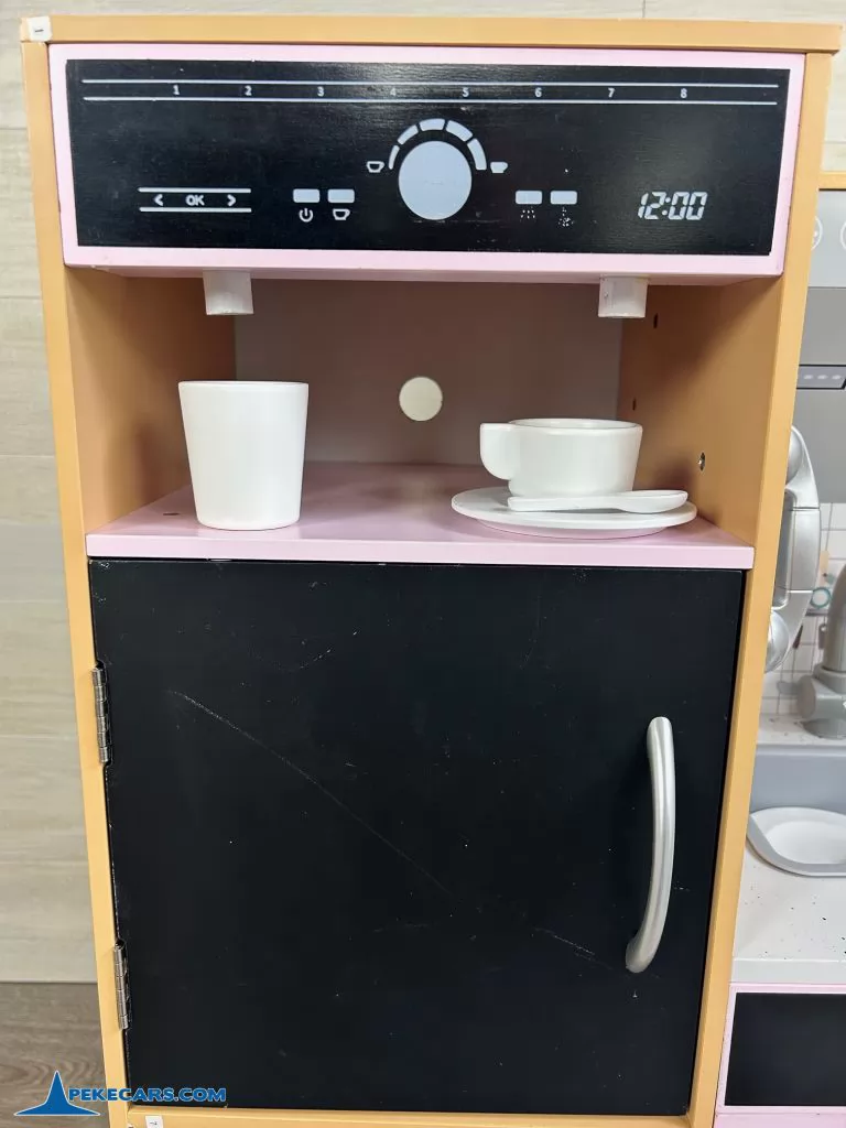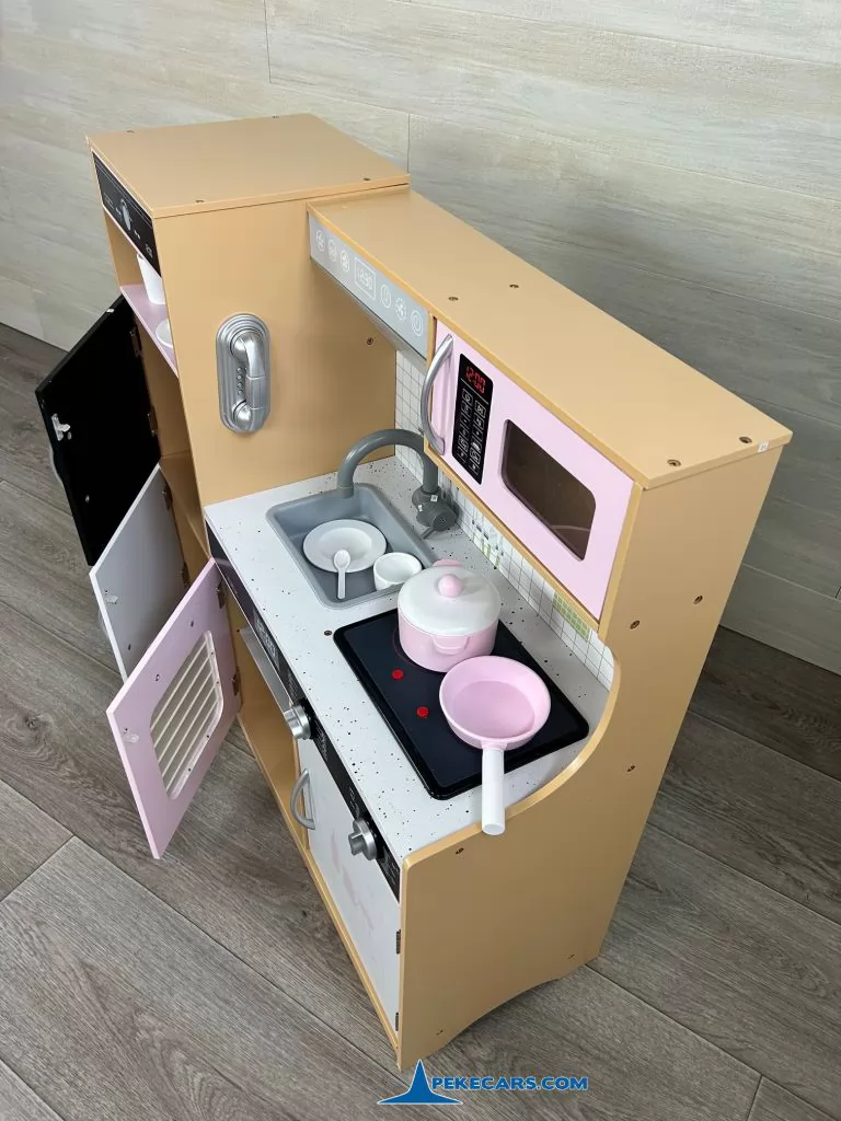 ¡Última novedad en nuestras cocinas infantiles de madera! Esta cocina de último modelo dispone de vitrocerámica, máquina cafetera con dos dispensadores y campana extractora de última generación, ¡única en el mercado!