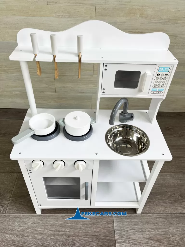 Disfruta de esta nueva cocinita para niños de Pekecars en un acabado muy moderno. Tiene varios estantes de almacenaje y un fregadero con acabado aluminio muy elegante, ¡casi como las de verdad!.