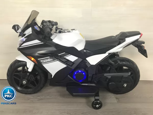 No te pierdas la nueva moto de carreras de Pekecars blanca. Una moto con doble bateria, asiento acolchado en polipiel y ruedas de caucho antipinchazos