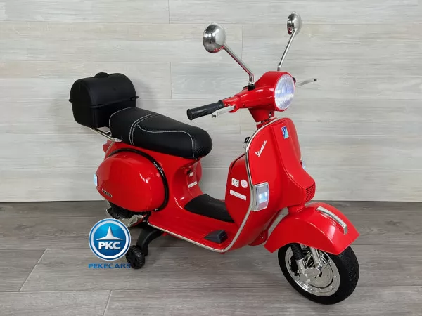 Este modelo trae consigo el maletín en la parte de atrás, para que los niños puedan guardar ahí sus juguetes mientras disfrutan de la moto Vespa. Y es que, a parte del maletero, también trae su asiento en poli piel, para una mayor comodidez.