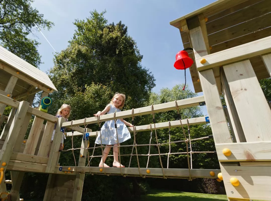 Espectacular conjunto ALPES, se compone de una torre Beach Hut y una torre Penthouse XL unidas por un puente. Dos casas elevadas de madera cuadrada para jardin. Casita de madera elevada a la que se accede subiendo por una escalera y se puede bajar por la rampa del tobogán. En la base se puede poner arena para jugar. Los complementos como la campana, periscopio, telescopio, volante, etc... no están incluidos pero se pueden comprar a parte.