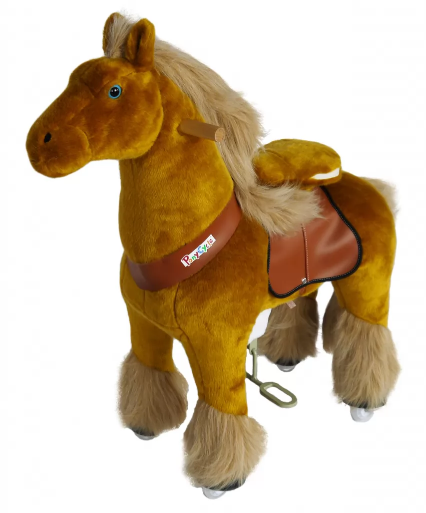Ponycycle pequeño para niños de 3 a 5 años Cowboy Azurro de color marrón y los ojos azules. Diviertete con este gracioso caballito. El Ponycycle Cowboy Azurro no necesita motor ni baterías para moverse, aprovecha la energía cinética de la niña o el niño para moverse con unos divertidos movimientos. Construido sobre una resistente estructura de acero y recubierto con un material muy blando e ignifugo, es como un peluche en el que te puedes montar.